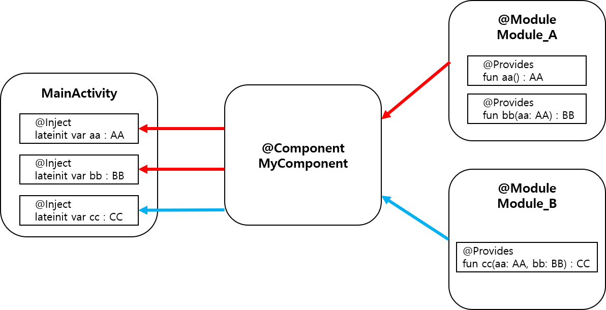 fun provideBB(aa: AA) : BB = BB(aa) // 필요한 인자(AA)를 Component로 부터 전달받아 BB 객체를 생성해서 Component에게 제공