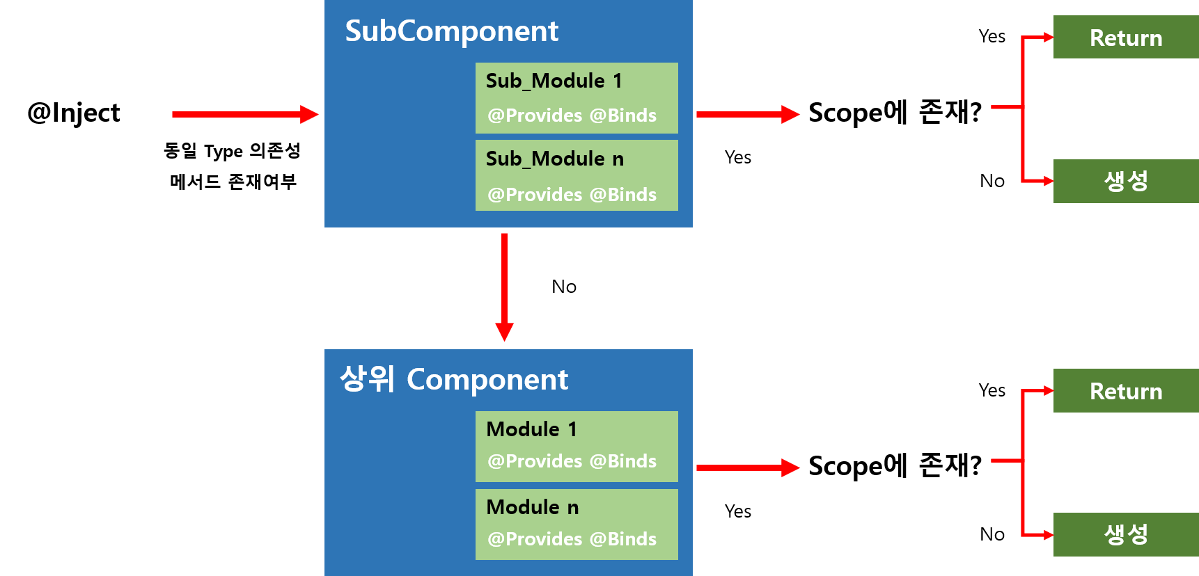 연결된 Module을 이용하여 의존성 객체를 생성하고, Inject로 요청받은 인스턴스에 생성한 객체를 전달(주입)합니다