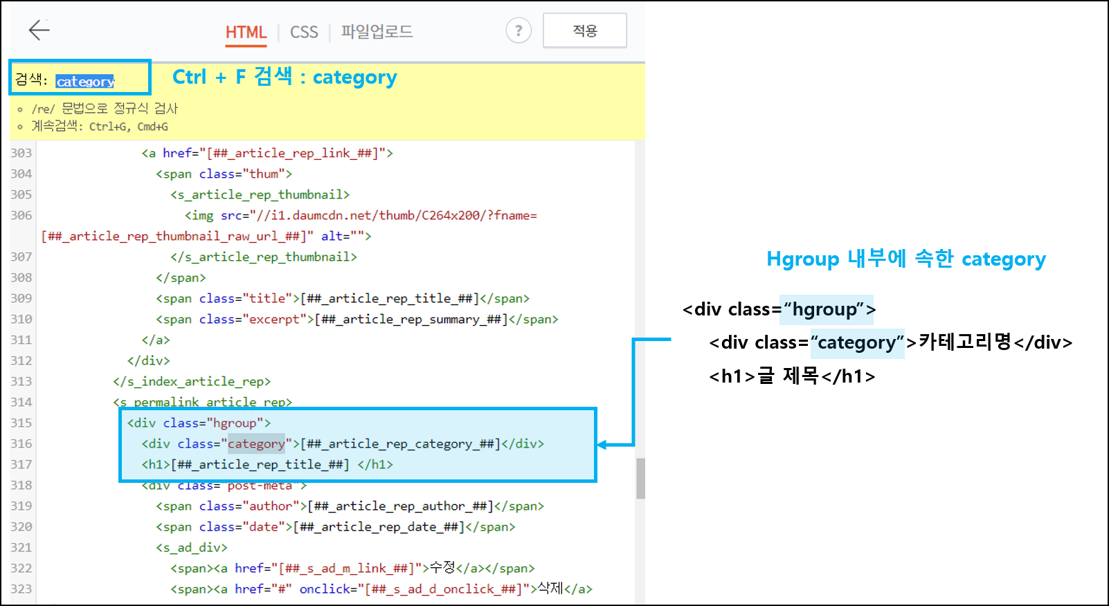 CSS에서 .hgroup .category { ... } 설정코드 부분을 찾아서 그 아래에 추가합니다