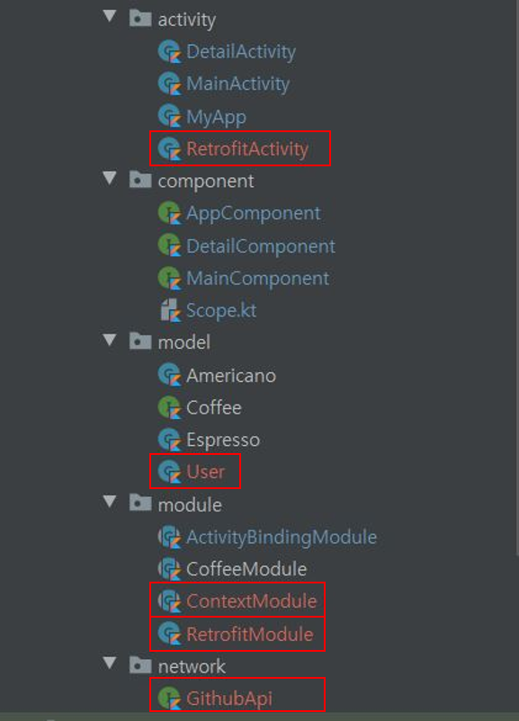 - module 패키지 : RetrofitModule 추가 (Retrofit DI) + ActivityBindingModule 수정 (RetrofitActivity 추가)