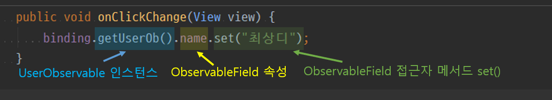 ObservableField 속성 Access 방법 (기존 setter/getter가 아닌 set() / get()접근자 메서드 사용)