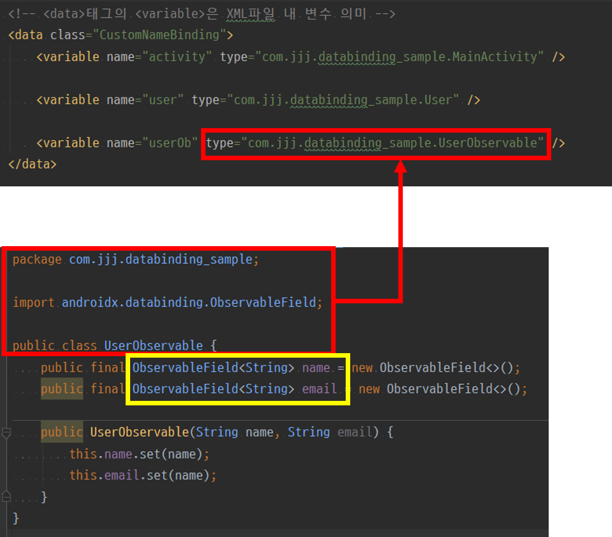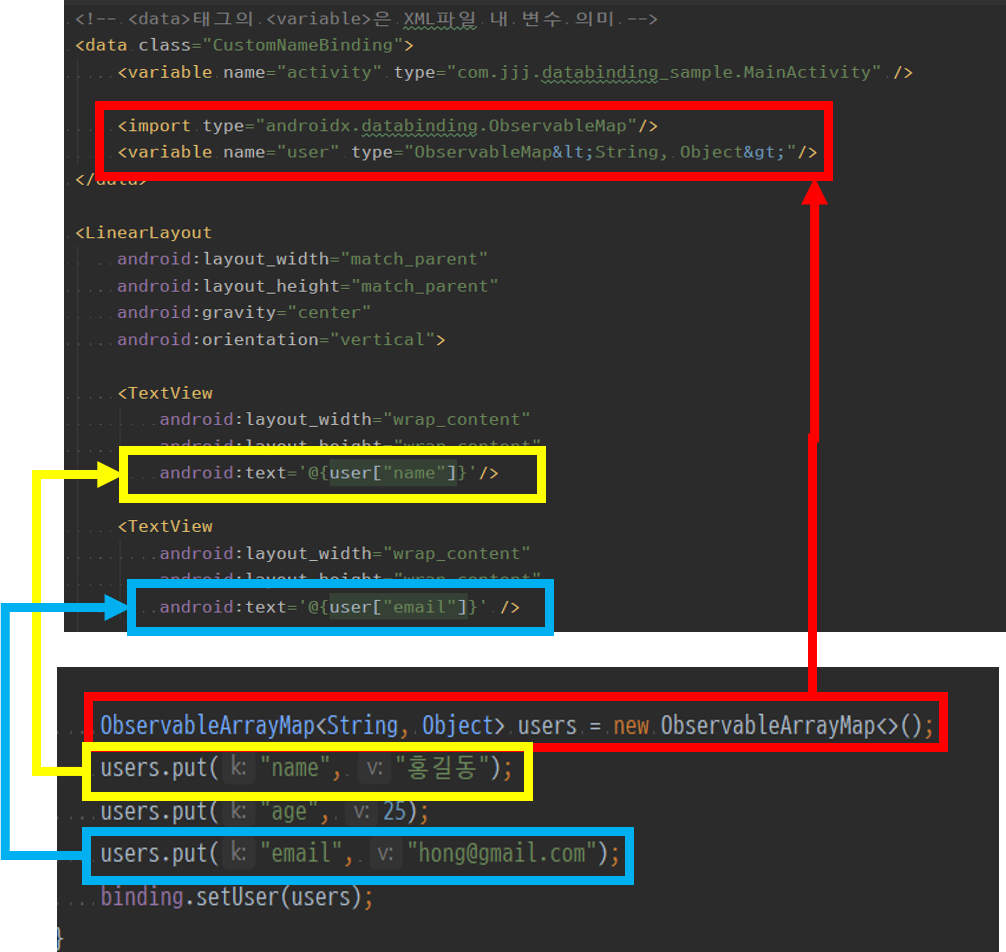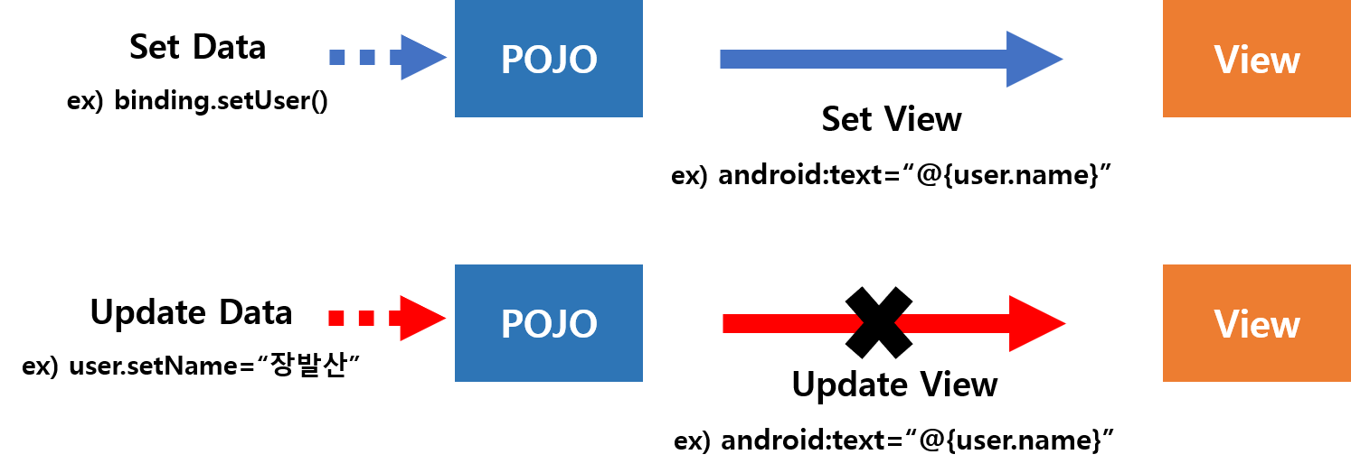 : DataBinding하면 POJO 값을 xml내 변수에 설정하여 xml에서 view가 변수의 값을 이용할 수 있습니다