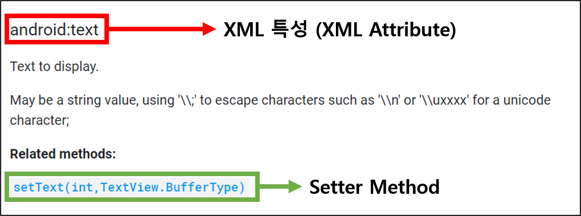 : TextView의 android:text 특성은 setText(int, TextView.BufferType)의 setter 메서드를 호출합니다